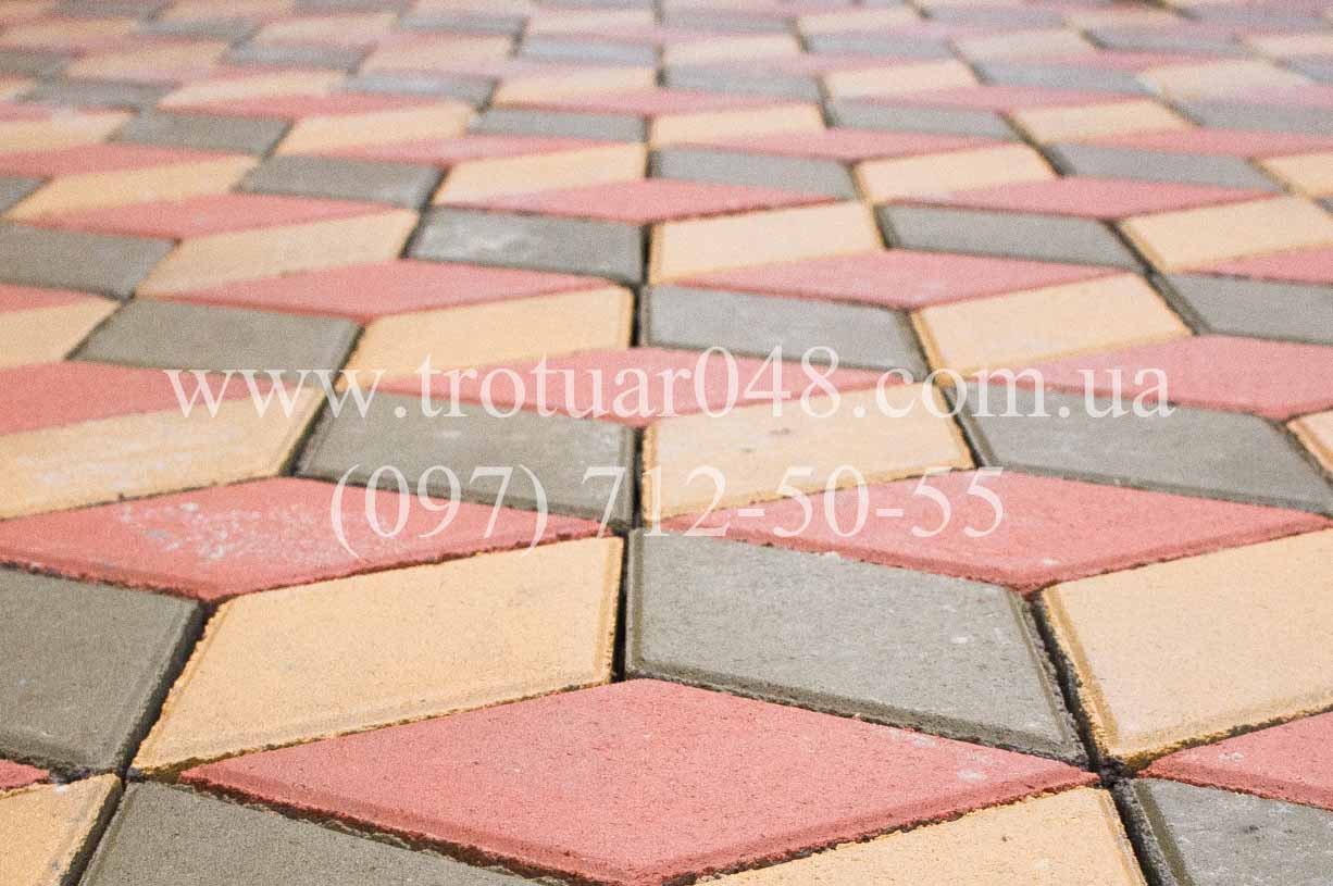 Вібропресована тротуарна плитка "Ромб" дозволить перетворити Ваше подвір'я у килим, який наповнений різноманітністю квітів, зірок, візерунків. Використавши три різних кольори "Ромба" (бажано контрастних), можна отримати об'ємні 3-D малюнки та фігури.